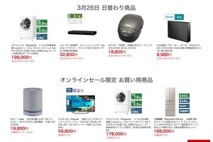 セールでは限定商品に加えて、日替わり商品も用意。日替わり商品の一例として、シャープのBDレコーダー「2B-C10CW1」が32,800円、パナソニックのドラム式洗濯機「NA-VG1500L-S」が198,000円、タイガーの炊飯器「JPK-H100」が18,800円(いずれも税込)が3月26日限定でセールに登場する。