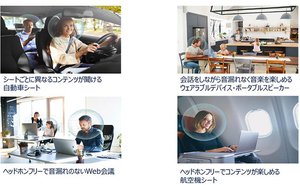 具体的な協業内容としては、ヘッドホンなしに各座席にパーソナライズされた音響空間を提供する自動車向けPSZ事業、同じくヘッドホン不要でウェブ会議参加や音楽の再生ができるチェア一体型音響事業、NTTソノリティ自社製品および他社の音響メーカー向けのウェアラブルデバイス事業が挙げられている。