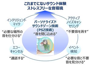 PSZ技術とは、耳周辺の特定エリアに限定して音を再生し、360度全ての方向に対してその音が漏れないようにする技術。特殊なハードウェア技術・音響信号処理技術が組み込まれた専用スピーカーにより、イヤホンやヘッドホンなどを使用せず、耳がオープンな状態でこれを実現。“究極のプライベートな音響空間の提供” を目指すとしている。