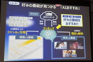 新たな機能として「AIおすすめ」が追加。これはAIが録画番組を恋愛/サスペンス/アクションなど20種類以上のジャンルに分類し、再生履歴からユーザーの嗜好を分析。ディモーラが持つ再生ランキングと照らし合わせながら、おすすめの番組を表示してくれるという、まさに動画配信サービスのレコメンドのような機能だ。