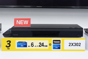2X302は3TBのHDDを搭載し、2K放送の最大6ch×24日間のチャンネル録画と1番組録画が可能。チャンネル録画6chのうち、BS/CSは最大5chまで選択可能で、端子はHDMI×1とUSB×1を装備。外形寸法は430W×60H×199Dmmで、質量は約2.9kg。