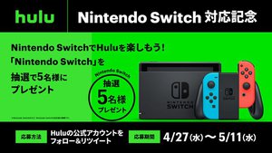 また、Nintendo Switchへの対応を記念したSNSキャンペーンも併せて開催。Hulu公式Twitterアカウント(@hulu_japan)をフォローの上、同キャンペーンツイートをRTすることでNintendo Switch(通常モデル)が抽選で5名にプレゼントされる。応募期間は本日4月27日から5月11日23時59分まで。当選発表はTwitterのDMにて行われる。