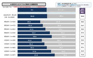 さらに、今年2月に開催された北京オリンピックの視聴状況も公開。約半数がテレビ放送を通じて視聴していると共に、昨年開催の東京オリンピックの時と同様、男女ともに年代が高くなるにつれ「見た」割合が増える傾向となった。