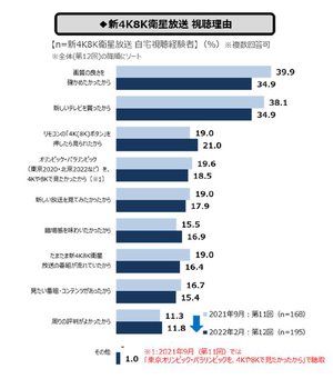 また視聴理由については、「画質の良さを確かめたかったから」「新しいテレビを買ったから」が約34.9%と一番多く、「画質への関心の高さ、及び購入をきっかけとした視聴の様子が伺える」と説明。加えて、18.5%が「オリンピック・パラリンピックを4Kや8Kで見たかったから」と回答しており、「オリンピックおよびパラリンピックを通じた新4K8K衛星放送への関心の高さも伺えた」としている。