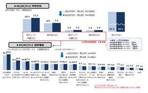 4K/8Kテレビの所有状況については、所有率は19.6%と引き続き徐々に増加。テレビの選択理由としては、「大きな画面のテレビがほしかったから」が32%と突出しており、次いで「これからは4K/8K の時代だと思ったから」が19.2%、「価格が安かったから」が17.6%と続いた。これら選択理由の上位3つは、前回とほぼ同じ傾向となった。