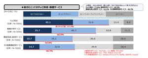そのほか、テレビ放送・動画サービスの現在の位置づけに関する調査では、テレビ放送を「なくてはならない」と重要視している層が4割半ば、「あった方がよい」と合わせると約8割がポジティブに捉えていると分析。他動画サービスと比較しても「テレビ放送」の方がよりポジティブに捉えられているとの見方を示した。