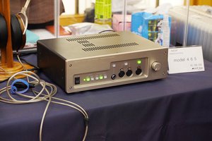 プロ用音響機材を手掛けているマス工房のブースでは、据え置きフルバランスヘッドホンアンプの新フラグシップモデル「model465」が出展された。価格は2,200,000円。