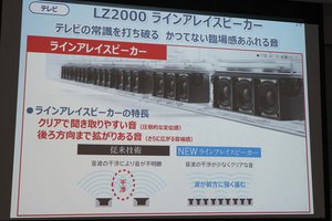 スピーカーシステムでは、フロント用にラインアレイスピーカーを新採用。従来のスピーカーユニットは半円状に音波を出すためお互いに干渉しあい、音が不明瞭になるポイントが存在していたが、前への強い指向性を持つユニットを複数、一列に並べることで音波の干渉が少ないクリアな音を楽しめるという。