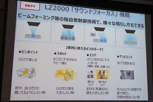 ラインアレイスピーカーの個数は77型で18個、65型で16個、55型で14個。ビームフォーミングなどの独自音制御技術で音の届け方を変えられる「サウンドフォーカス」機能を搭載しており、自分ひとりだけに音を届ける「ピンポイント」や、複数人のうちひとりだけ大きく聴こえるようにできる「スポット」など、4つのリスニングモードに切り替えることが可能。
