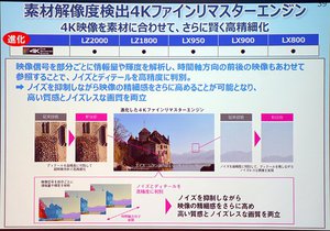 「4Kファインリマスターエンジン」「AI HDRリマスター」といった高画質化機能は上位機LX950/LX900同様に進化させたものとを搭載。「4Kファインリマスターエンジン」では、映像信号に対して部分ごとに情報量や輝度を分析し、時間軸方向の前後の映像もあわせて参照することで、ノイズとディティールを高精度に判別。これによってノイズを抑制しながら映像の精細感をさらに高めることが可能になったとのことで、高い質感とノイズレスな画質を両立したとしている。