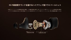ブランドのフラグシップモデルとして、音質とノイズキャンセリングにおいて大きな進化を遂げたと謳う完全ワイヤレスイヤホン。ドライバーはダイナミック型とBA型によるハイブリッド構成で、ダイナミック型ユニットにはDLC(Diamond Like Carbon)コーティングを施した振動板を採用。各ドライバーの特徴をバランスよく組み合わせたとする。