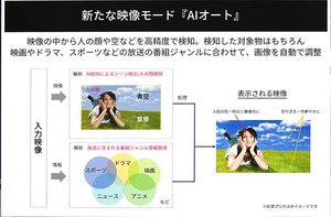 新開発のAIプロセッサーを採用した画像処理エンジン「Medalist S3」を採用する。それに伴い、新たな映像モード「AIオート」を搭載しており、100万以上の映像を学習したAIによって、人の顔や空などを高精度に検知し、番組ジャンルやコンテンツに合わせて色彩、明暗、精細感を自動調整し、最適な映像で楽しむことができるとする。