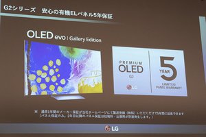 さらにOLED G2では、新たに有機パネル5年保証のサービスを開始する。メーカー保証は通常1年間となっているが、ホームページから無料の製品登録をすることで5年に延長できるというもの。保証されるのはパネルのみで、2年目以降は技術料・出張料が別途発生するとのこと。
