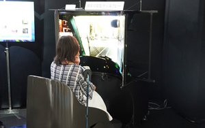 展示では振動する「いす型触覚デバイス」とも連携させていた。これは音声信号を振動に変換することで、座面と足元の振動子に伝達するとともに、速度推定などの画像解析により映像の内容に応じて振動を制御することで、映像の動きや大きさに連動した振動を実現するもので、画面との組み合わせでより没入感の高い体験を提供するとしている。