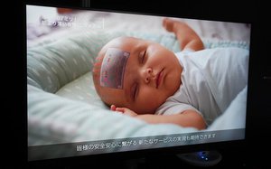 シャープと共同開発した薄型4K有機ELフレキシブルディスプレイは、厚さ0.5mmで折り曲げたり丸めて持ち運びができることが特徴。本展示では、30インチの同ディスプレイを4枚用いて貼り合わせた、8K表示ディスプレイを展示していた。