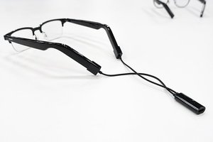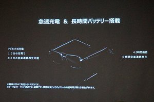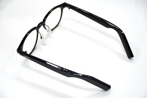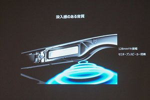 テンプル(つる)部分にはセミオープンスピーカーを搭載する。128mm2の大型振動板を用いた指向性スピーカーで、これに対して上下に空洞を設けた音漏れ防止ホール設計を採用することで、出力音とは逆音波を物理的に発生させて周囲への音漏れを抑えられるという。