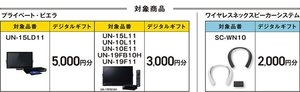 「家じゅうどこでも!プライベート・ビエラキャンペーン」は、プライベート・ビエラの対象モデルを購入し、ウェブから応募することでデジタルギフトがもらえるキャンペーン。「UN-15LD11」の購入で5,000円分、「UN-15L11/10L11/10E11/19FB10H/19F11」の購入で3,000円分を獲得することができる。