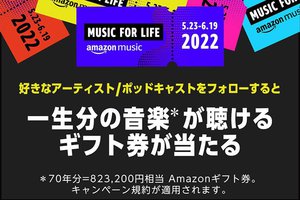 Amazonは、Amazon Musicで好きなアーティストもしくはポッドキャストを「フォロー」すると、およそ70年分に相当する “一生分の音楽が聴けるギフト券” が抽選で当たるキャンペーンを、6月19日23時59分まで実施している。