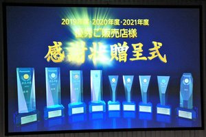 3カ年合同となった今回の入賞は延べ1,714店(重複での入賞あり)となり、各年の各賞概要は以下の通り。感謝状贈呈式には938店が出席し、壇上にのぼった各賞の代表者ひとりひとりに、楠見社長から記念のトロフィーが手渡された。