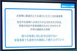 「事業の価値は社会やお客様に選んでいただけるための競争力。すなわち、社会やお客様へお役立ちする上での力。それが大きければ、事業の内容や規模の大小にかかわらず、パナソニックグループにとっては大切な価値ある事業」と訴えた。従って、基幹事業やコア事業といったものは設けず、「将来、自分たちが人々のくらしをどのように変えていくことが社会にとって一番よいのかを描き切り、より早く実現させていくための競争力を徹底して磨いていく」と語気を強めた。
