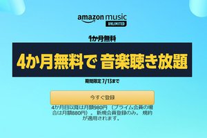 Amazonは、サブスクリプション型音楽配信サービス「Amazon Music Unlimited」を無料で4ヶ月試せるキャンペーンを開催している。キャンペーン期間は7月13日23時59分まで。