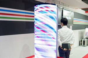 台湾の大手半導体メーカー、フォックスコングループの液晶パネル製造会社Innolux Corporationは、厚さ約1mmでR75mmまでの折り曲げに対応するフレキシブルminiLEDディスプレイ「H5512A」を展示。一般で使用されるテレビの20%以下を謳う低消費電力と約4kgの軽量設計による設置性の高さをアピール。現在使用されている液晶モニタータイプのサイネージからの置き換え需要を見込み、日本国内での展開を行っていくとのこと。