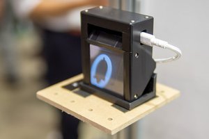 光センサーによるジェスチャーセンシングを誘導する、空中結像技術「空中ディスプレイ」は同社のビジネスパートナーでもあるアスカネットの提供によるもの。同社スタッフによると、アニメーションを描画するディスプレイと空中結像に必要なガラスプレートの配置間隔や屈折方法を見直すことができればモジュールの薄型化を実現できるとしており、今後のさらなる技術発展に意気込んでいた。