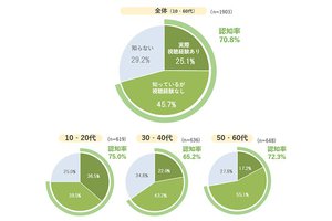 「リアルタイム配信」は、4月11日から民放キー局も開始した、地上波放送と同時にスマホ・PC・タブレットでテレビ番組視聴が可能なサービス。まず、リアルタイム配信の認知と利用状況については、全体で認知率が70.8%、利用経験は25.1%で4人に1人が実際に利用経験があることが明らかとなった。年代別では特に10-20代が高く、認知率が75.0%、利用経験率が36.5%にのぼった。