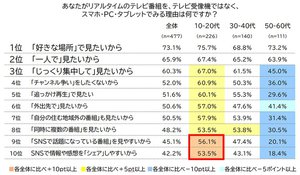 リアルタイムのテレビ番組をテレビ受像機ではなく、スマホ・PC・タブレットで見る理由については、「好きな場所で見たいから」が最も多く73.1%を占めた。次いで「1人で見たいから」が65.9%、「じっくりと集中して見たいから」が60.3%と続く。いずれの年代でも同様の理由が高い割合を占めている。加えて10-20代では「SNSとの連携のしやすさ」を理由として挙げる人も多くなっている。