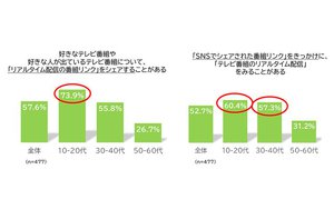 また、リアルタイム配信利用者のうち57.6%は「好きなテレビ番組について、リアルタイム配信の番組リンクをシェアすることがある」と回答。特に10-20代では73.9%が番組リンクのシェアを行っている。さらに、「SNSでシェアされた番組リンクからリアルタイム配信を見ることがある」と答えた人が全体で52.7%を占め、10-20代(60.4%)のみならず、30-40代(57.3%)でも高い割合を示している。