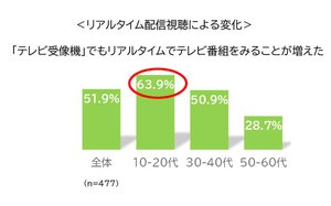 リアルタイム配信をきっかけに、テレビでのリアルタイム視聴も増加していることもわかった。特にテレビ離れが指摘される10-20代では63.9%が「テレビでのリアルタイム視聴が増えた」と回答した。
