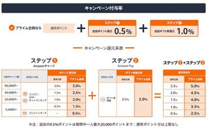 こちらは、プライム会員で、かつコンビニ・ATM・ネットバンキングでチャージした場合が最も還元率が高くなる。チャージ額によって還元されるポイントも変わり、9万円以上チャージすると、最高で3.0%のポイントがもらえる。通常は最高2.5%のところ、プライムデーにあわせて還元率が高まっているのだ。