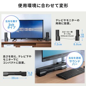左右の筐体を離せば2chのステレオスピーカーとして、連結すればサウンドバーとして使用できるという、2つの設置方法を選べることが特徴。パソコンやテレビの両側に設置すれば広がりのある音を楽しむことができ、サウンドバー形状にすることで高さを抑えられ、テレビやモニターの下のスペースにも設置できるとしている。