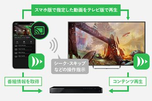 同機能への対応により、スマホ版アプリで再生中の録画番組を、テレビ版アプリを通じて途中から大画面で視聴したり、テレビ版アプリで視聴したい番組を、手元にあるスマホ側から選んでキャストすることなどができる。