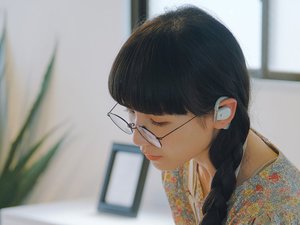 「ARC」は、一般的な“耳をふさがないイヤホン”とは一線を画す高い実用性と快適性、音質を実現したオープン型完全ワイヤレスイヤホン。シルバーのヒンジ部分が可動式となっており、装着の際に耳にひっかけるだけで耳の形を問わず優しくフィット。眼鏡をかけている人でも快適に使用できるとアピールする。