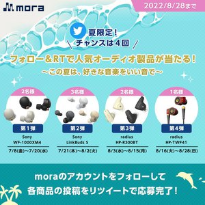 応募方法は、moraのTwitter公式アカウント(@mora_info)をフォローし、該当商品のツイートをリツイートすることで完了。当選発表は、当選者のみに公式アカウントからダイレクトメッセージ(DM)にて通知され、賞品発送先入力フォームのURLが送付される。
