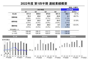 シャープは、2022年度第1四半期の連結決算業績についての説明会を開催した。連結業績は、売上高が前年同期比8.1%減の5621億円、営業利益が同66.7%減の61億円、経常利益が同31.9%減の174億円、最終利益が同24.3%増の269億円となった。