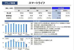 セグメント別では、ブランド事業のスマートライフで売上高は前年同期比ほぼ横ばいの1,109億円に。白物家電は国内が減少したものの、海外が大きく伸長して増収になった。一方で、国内では中国ロックダウンによる生産の影響から、エアコンや洗濯機が減収。空気清浄機も需要が一巡して減収となった。しかし海外やアジアで冷蔵庫や洗濯機が大幅増収。欧米を中心に調理機器も好調に推移した。