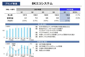 ブランド事業の8Kエコシステムでは、売上高が前年同期比1.7%増の1,398億円。テレビ事業で減収となったものの、ビジネスソリューション事業が伸長した。