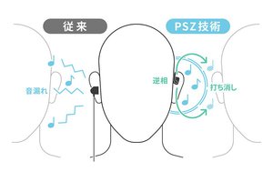 PSZはPersonalized Sound Zone(パーソナライズドサウンドゾーン)の略。同技術では、ドライバー(音の出口)から一定距離にある、耳周辺の極小さな特定エリアに限定して音を再生し、ある音波(正相)に対して逆相の音波を当てることで音波同士が打ち消し合う作用を活かすことで、360度全ての方向に対してその音が漏れないようにするという。