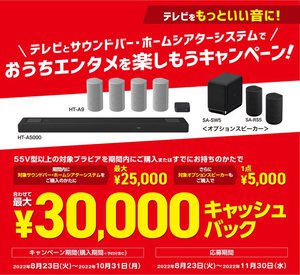 ソニーは、対象のブラビア購入者を対象に、サウンドバーやホームシアターシステム、オプションスピーカーを購入すると最大30,000円をキャッシュバックする「テレビとサウンドバー・ホームシアターシステムでおうちエンタメを楽しもう キャンペーン」を本日8月23日より実施する。期間は10月31日まで。