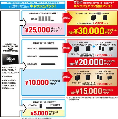 本キャンペーンは、4Kテレビ “BRAVIA” シリーズの55型以上の対象モデルを購入、もしくはすでに所持している方を対象に、期間内に本日発表の「HT-A5000」「HT-A3000」も含む対象のサウンドバーや、ホームシアターシステム、オプションスピーカーを購入すると、最大30,000円がキャッシュバックされるというもの。