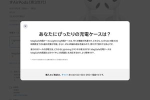 アップルは、完全ワイヤレスイヤホン「AirPods(第3世代)」の “ワイヤレス充電非対応” モデルをApple Storeにて発売した。価格は26,800円(税込、以下同)。