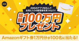 音楽ストリーミングサービスのAWAは、「ラジオ配信ラウンジ」のリスナーを対象に、Amazonギフト券1万円分が抽選で100名に当たる総額100万円のプレゼントキャンペーンを本日9月13日より開催する。期間は9月20日まで。