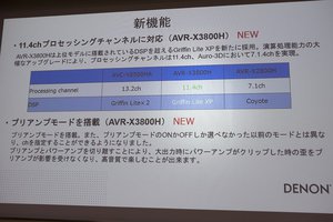 AVR-X3800Hは、9.4ch出力が可能なミドルクラスAVアンプ。.4chとある通り、サブウーファーを最大4機接続することが可能で、同社の営業を担当する田中清崇氏は「上位モデルより性能の高いDSP『Griffin Lite XP』の搭載により実現した」と説明。実際の使い心地について「マニアックな機能ではあるが、前方と後方の左右にサブウーファーを置くと、低音の動きが感じられて非常に面白い」と語っていた。