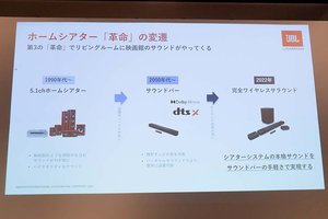 またホームシアターシステムの流れとして、これまで2回の「革命」があったと解説。1990年代からの5.1chホームシアター、2000年代からのサウンドバーがそれぞれ革命を起こしたジャンルであり、今回登場するBAR 1000で同社は「第3の革命」を狙う。