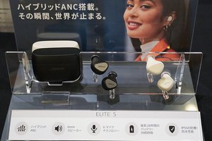 Jabraは完全ワイヤレスイヤホンの現行ラインナップ6モデルを一斉展示。9月2日に発表・発売されたばかりのハイブリッドANC搭載完全ワイヤレスイヤホン「Elite 5」を中心に、上位モデル「Elite 7 Pro」や「Elite 85t」、エントリー向け「Elite 3」などが並んでいた。