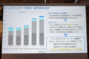 価格帯の構成比をみると、巣ごもり需要期の段階では、先行き不透明であることや、これまでプロジェクターを使用したことのないユーザーが試しに購入するといったケースから、5万円未満の商品が中心になっていたという。一方でwithコロナとなる2021年以降は、ホーム向けや小型プロジェクターの認知が進むことで、より機能性のある、または使いやすさを求めるユーザーが5〜10万円の製品購入にシフトしていったとする。
