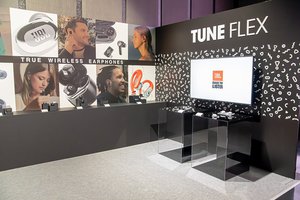 イベントでは完全ワイヤレスイヤホン「TUNE FLEX」、およびBluetoothスピーカー「PULSE 5」といった新製品とともに、複数の参考展示品が並べられた。JBL「BAR1000」は、現在クラウドファンディングを実施している7.1.4chサウンドバーだ。GREEN FUNDINGにおける支援金額1,000万円突破の最速記録を更新するなど、高い注目を集めている。