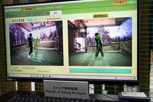 富士通では、体操競技のAI採点におけるセンシング技術(マーカーレスモーションキャプチャー)をゴルフトレーニングに応用した、スイング解析システム「AIGIAシステム」のデモンストレーションを実施。実際にスイング体験できるということもあり、ブース来場者から非常に多くの注目を集めていた。